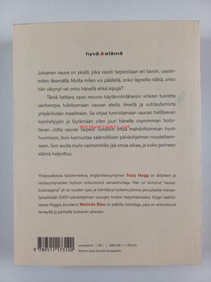 Muu(t) tekijä(t): Elina (suom.) LustigSarja: Hyvä elämäAlkuteos: Secrets of the Baby Whisperer. How to Calm, Connect and Communicate With Your BabyAsiasanat: psyykkinen kehitys, lastenhoito, vauvat, lasten kehitys