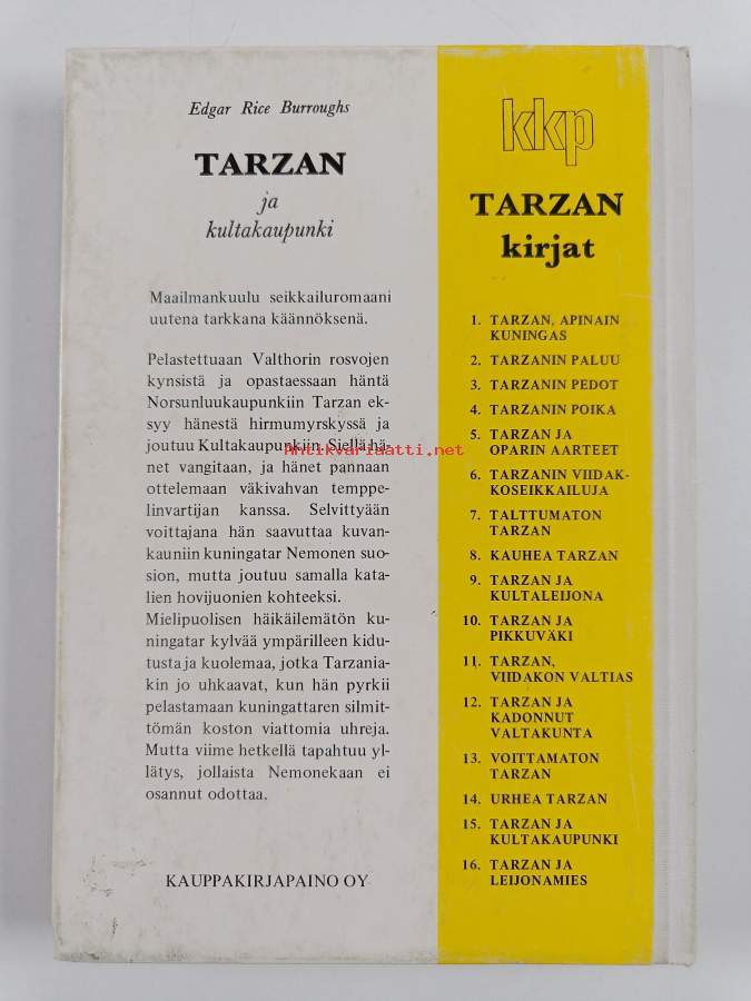 Muu(t) tekijä(t): Jaakko V. Tapio, K. LintulaMerkinnät: omistajamerkintäAlkuteos: Tarzan and the city of goldAsiasanat: seikkailukirjat, viidakkoseikkailut