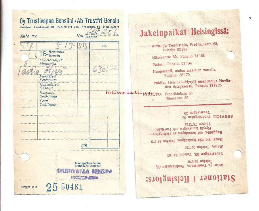 Trustivapaa Bensiini TB 1953 huoltoasemakuitti - firmalomake