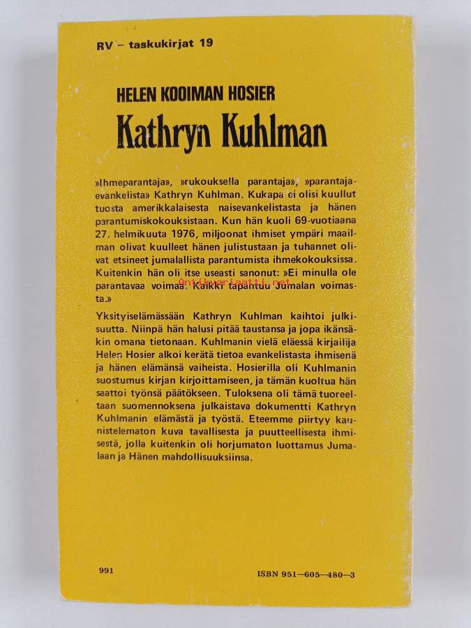 Muu(t) tekijä(t): Inka PekkanenMerkinnät: omistajamerkintäSarja: RV-taskukirjat 19Alkuteos: Kathryn KuhlmanAsiasanat: elämäkerrat, ihmeparannus