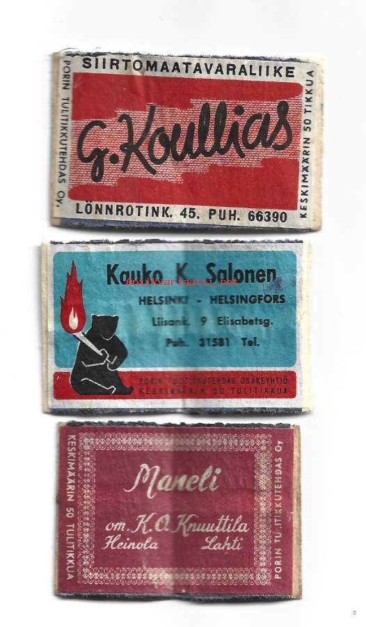 Maneli, G Koullias, Kauko K Salonen- tulitikkuetiketti tulitikkuaskin vanerikansi 3 eril