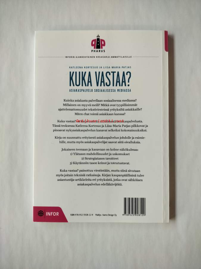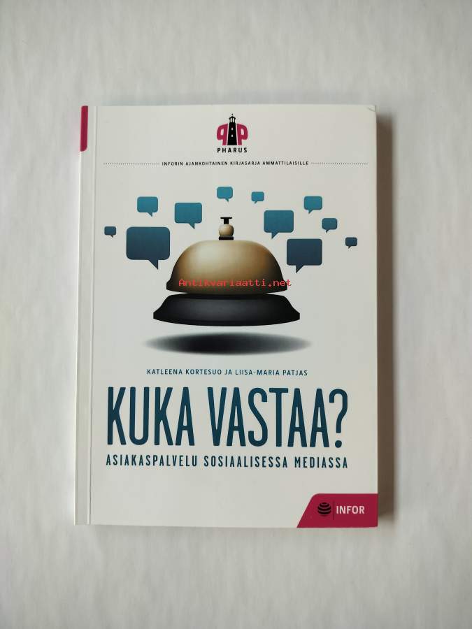 Kuinka asiakasta palvellaan sosiaalisessa mediassa? Millainen on myyvä mieli? Mitkä ovat tyypillisimmät ajattelemattomuudet tekstiviesteissä yrityksiltä asiakkaille? Miten chat toimii asiakkaan kanssa? Kuka vastaa? on kirja uudesta sähköisestä asiakaspalvelusta. Tässä teoksessa Katleena Kortesuo ja Liisa-Maria Patjas pilkkovat ja pinoavat nykyasiakaspalvelun kanavat selkeiksi kokonaisuuksiksi.Kirja on suunnattu erityisesti asiakaspalvelun johdolle ja esimiehille, mutta myös asiakaspalvelijat saavat siitä oivalluksia.
