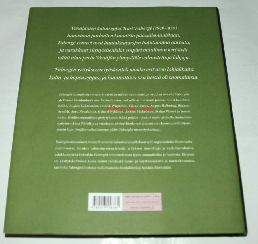 Taitavat ja luotettavat ammattimiehet ovat usein menestyksen tae. Fabergén yrityksessä työskenteli joukko erityisen lahjakkaita kulta- ja hopeaseppiä, ja huomattava osa heistä oli suomalaisia. Teos valottaa näiden suomalaisten seppien osuutta Fabergén ylellisessä korutuotannossa. Fabergén suomalaiset mestarit esittelee kukoistavan yrityksen työn organisointia Moskovasta Lontooseen, korujen valmistusmenetelmiä, yrityksen tunnettuja ja vaikutusvaltaisia asiakkaita sekä tietenkin Fabergén tunnistettavan tyylin suunnittelua ja luomista. Kirjassa on yksityiskohtaisia kuvia taiten tehdyistä taide- ja käyttöesineistä sekä mielenkiintoisia tarinoita Fabergén loistoon vaikuttaneista suomalaisista mestareista. Heistä useimpien sukujen tarina seuraa Fabergén menestystä aina sen äkilliseen loppuun saakka. Kirjassa on kuva-aineistoa, jota ei ole esitelty aiemmin kuin numeroidussa koruteoksessa.