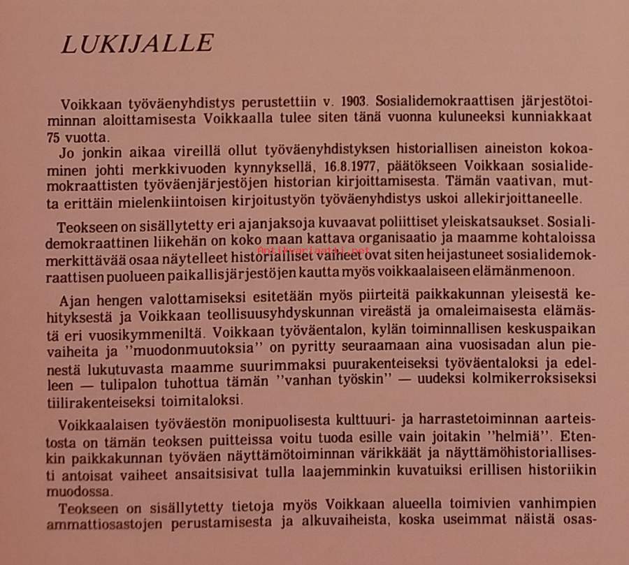Työväenjärjestöjen historian lisäksi kirjassa esitetään myös piirteitä paikkakunnan yleisestä kehityksestä ja Voikkaan teollisuusyhdyskunnan omaleimaisesta elämästä eri vuosikymmeninä. Kuvitettu. Dimensiot 25 ¤ 19 cm.