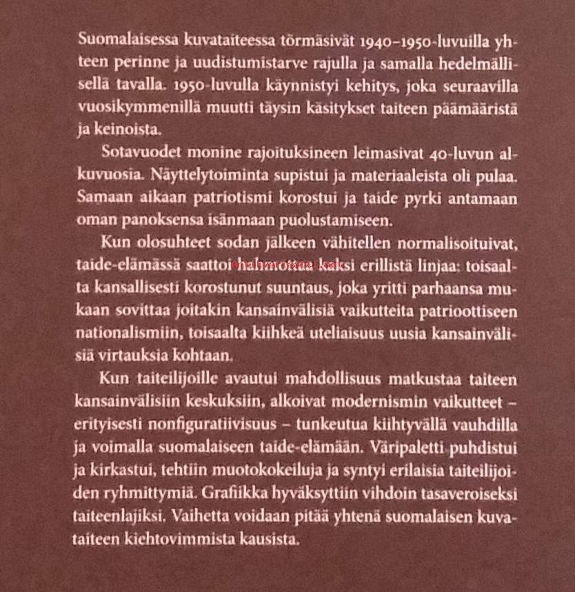 Teos tarkastelee, miten sotavuosien rajoitukset ja isänmaallisuus vaikuttivat taiteeseen, ja kuvaa modernismin vaikutuksen nousua sodan jälkeen esitellen myös taiteen uusia suuntauksia. Dimensiot 26 ¤ 22 cm. Kuvitettu.