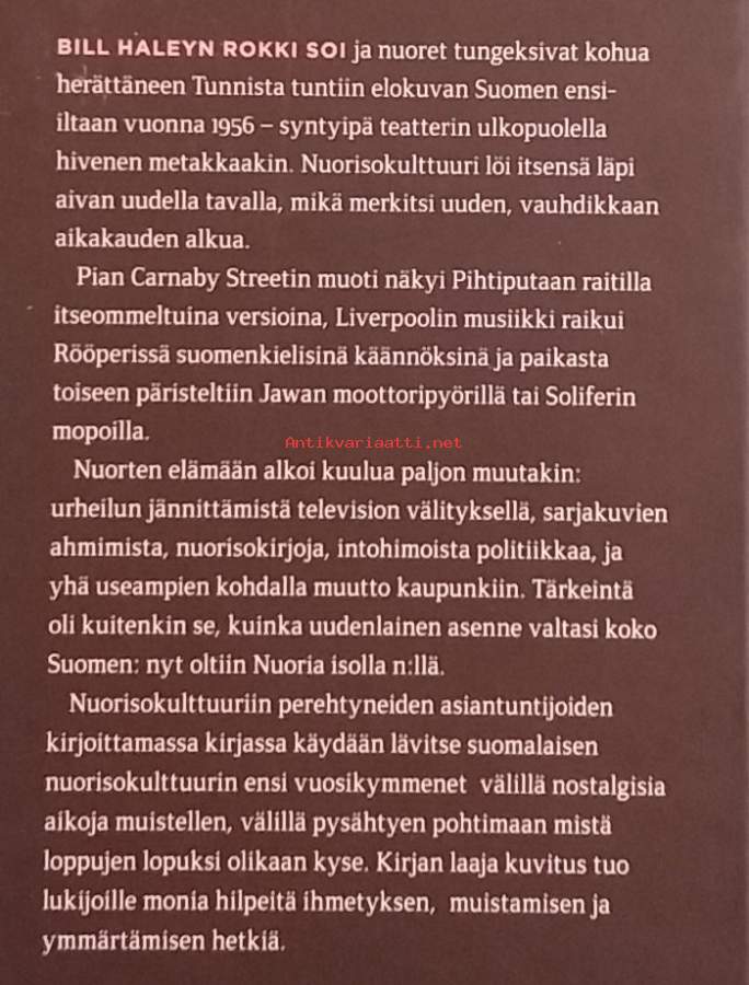 Yhteiskunnallinen teos käsittelee suomalaisen nuorisokulttuurin kehitystä 1950-luvulta 1970-luvun loppuun luoden katsauksen siihen, miten nuoriso nousi näkyväksi yhteiskunnalliseksi ja kulttuuriseksi voimaksi sodanjälkeisessä Suomessa. Kuvitettu. Dimensiot 24 ¤ 17 cm.