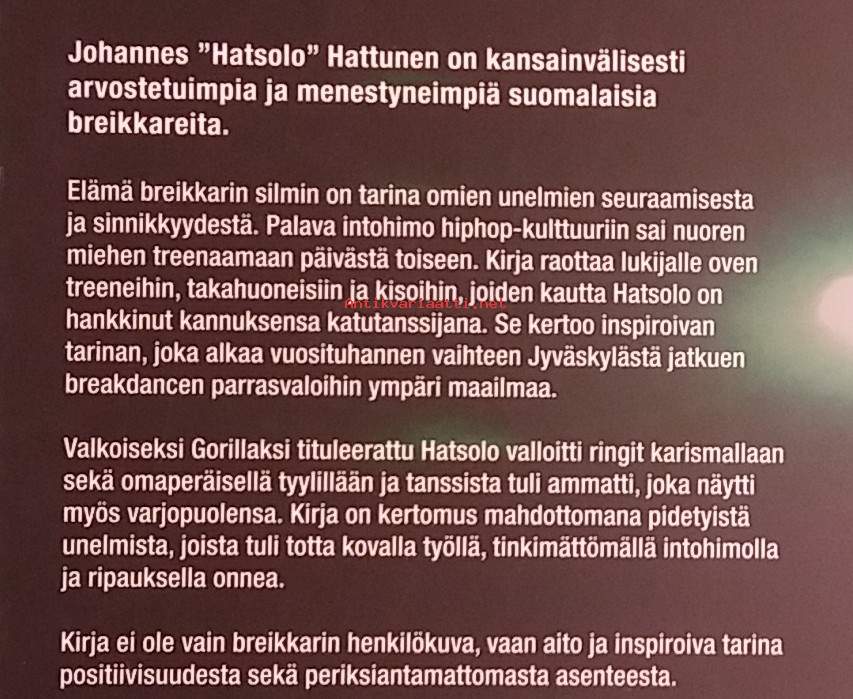 Teos tarjoaa ainutlaatuisen näkökulman breakdancen maailmaan, hip hop - kulttuuriin ja unelmien tavoitteluun suomalaisen breikkarin silmin. Kuvitettu. Dimensiot 23 ¤ 15 cm.