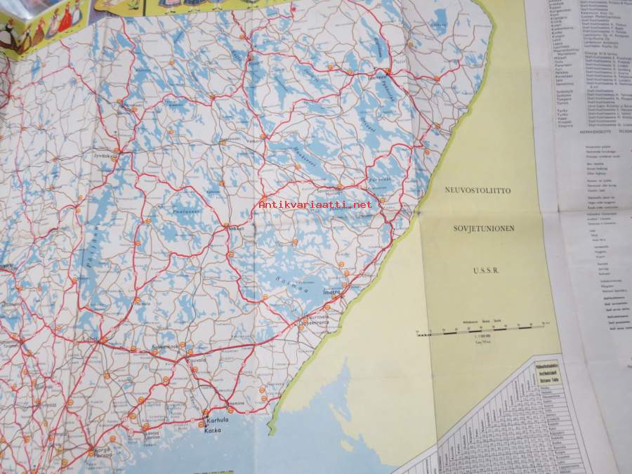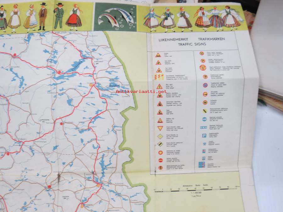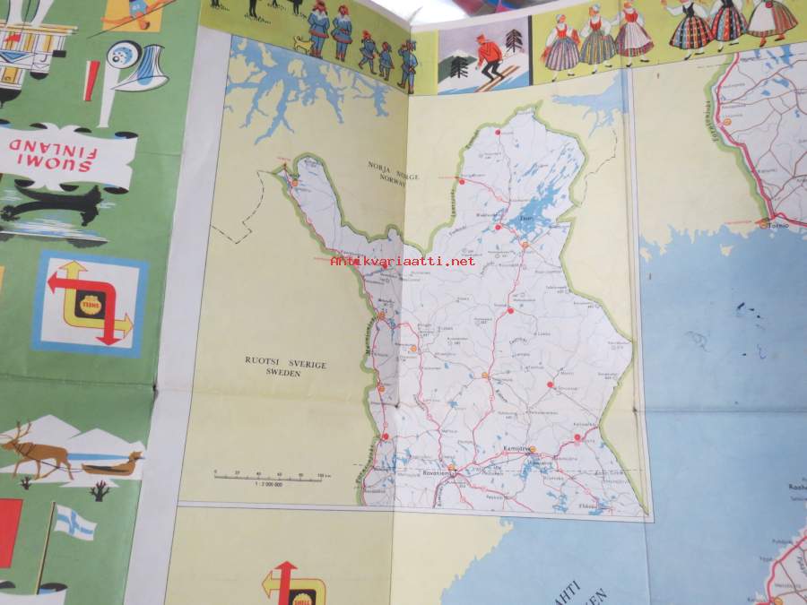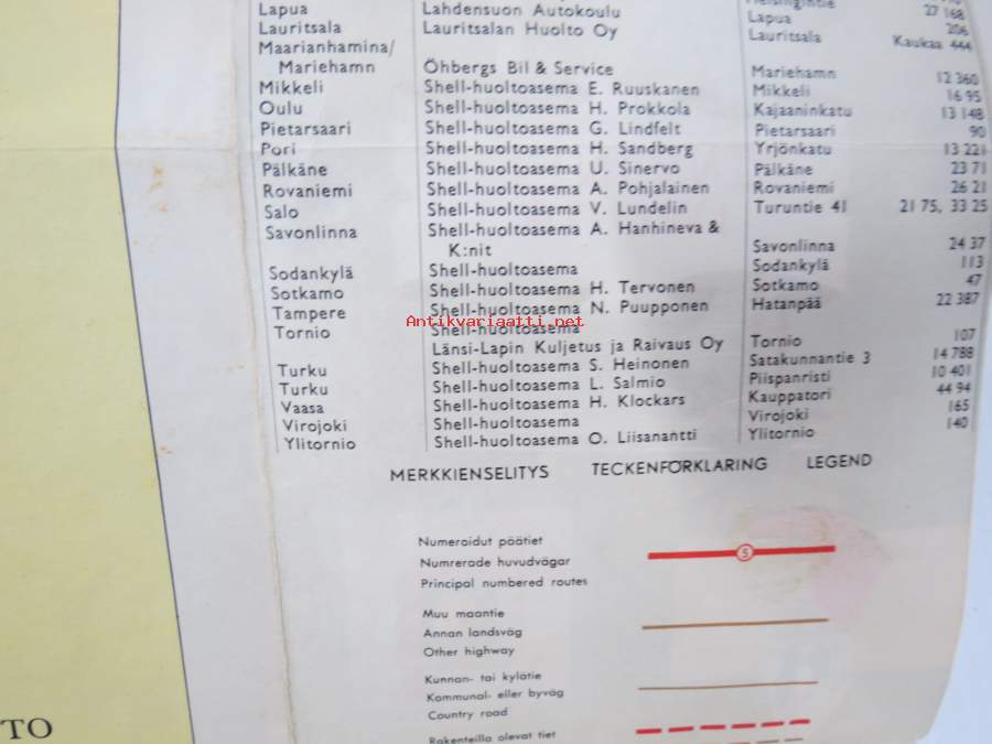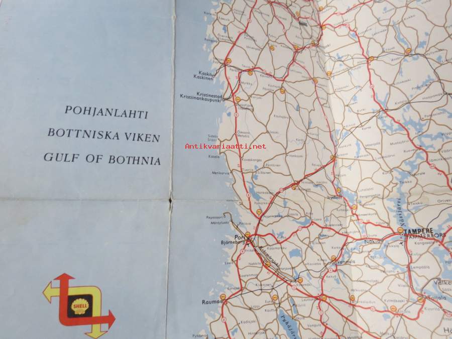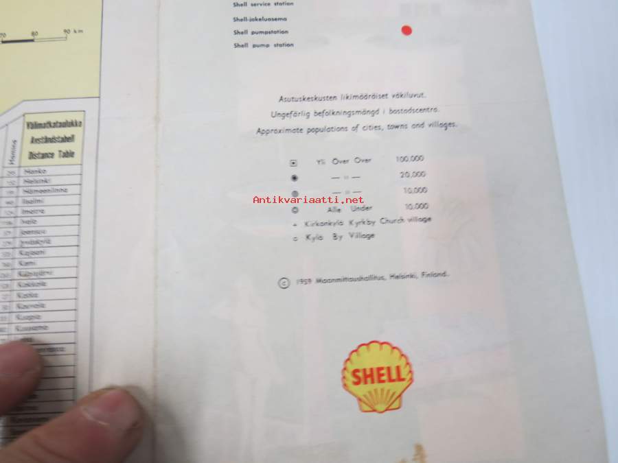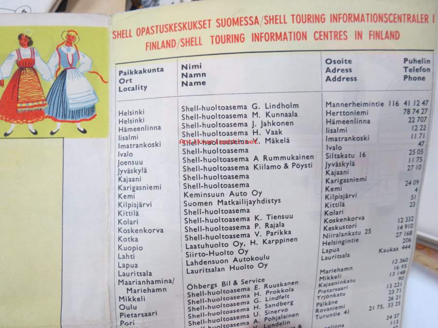 Shell Suomi-Finland 1959 Matkailukartta, sisältää kaupunki- / paikkakuntakohtaiset opastuskeskukset