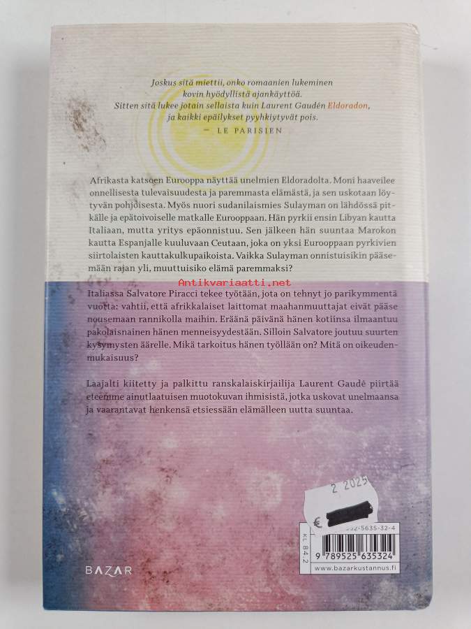 Muu(t) tekijä(t): Lotta ToivanenAlkuteos: EldoradoAsiasanat: kaupungit, ystävyys, siirtolaiset, yksinäisyys, köyhyys, unelmat, pakolaiset, oikeudenmukaisuus, laiton maahanmuutto, rajavalvonta, hyväksikäyttö, kapteenit, psykologiset romaanit, yhteiskunnalliset romaanit, maastamuuttajat, sääli
