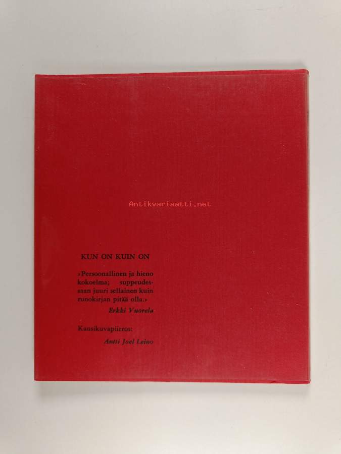 Hyvä. Tarkempi kuntoluokka: K3+ ; Pienoista käytön jälkeä kansissa, selkämyksessä hieman vinoutta. Kansipaperin kunto: jonkin verran nuhruisuutta & tahraisuutta