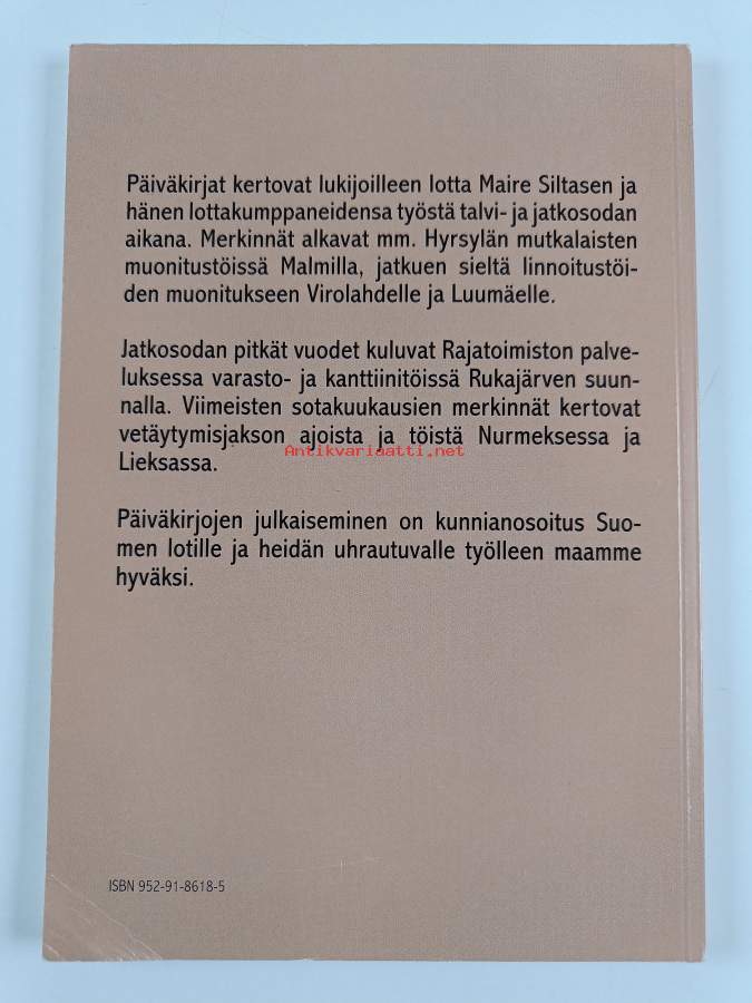 Muu(t) tekijä(t): Eila Kulmala, Seppo SiltanenMerkinnät: omistajamerkintäAsiasanat: talvisota, jatkosota, päiväkirjat, sota-aika, lotat, vinterkriget, fortsättningskriget, dagböcker, krigstid, lottor