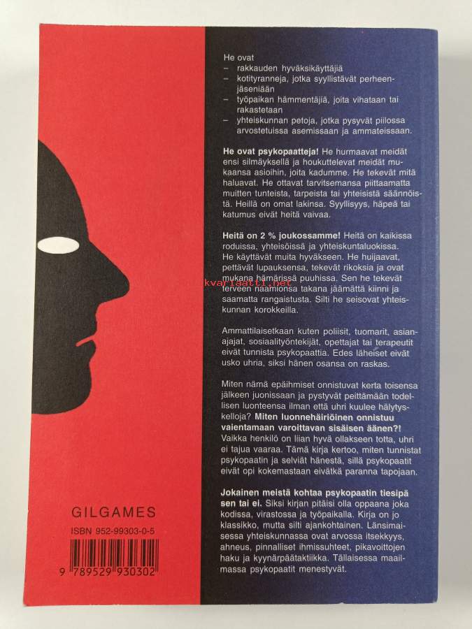 Muu(t) tekijä(t): Veijo (suom.) Kiuru, Pirjo (suom.) HaapojaAlkuteos: Without conscience : the disturbing world of the psychopaths among usAsiasanat: psykopaatit, sosiopatia
