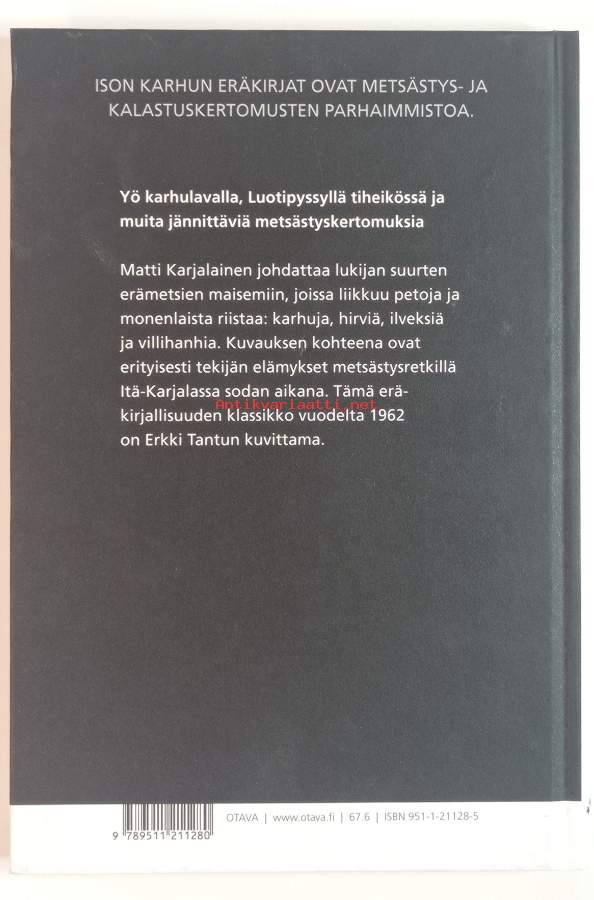 Teos johdattaa lukijan suurten erämetsien maisemiin joissa liikkuu petoja ja riistaa. Kuvauksen kohteena ovat erityisesti tekijän elämykset metsästysretkillä Itä-Karjalassa sodan aikana.Dimensiot: 23x15cm