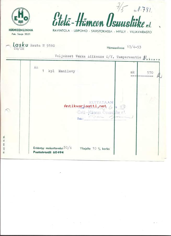 Etelä-Hämeen Osuusliike rl y Hämeenlinna 1953 - firmalomake