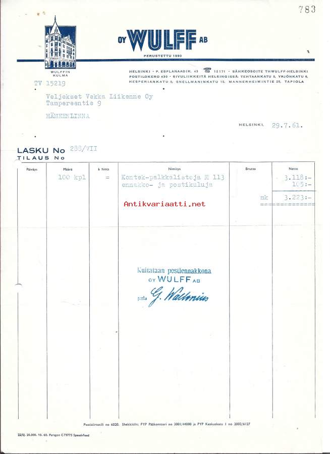 Oy Wulff Ab ritskåp, ritbord -myyntiesite