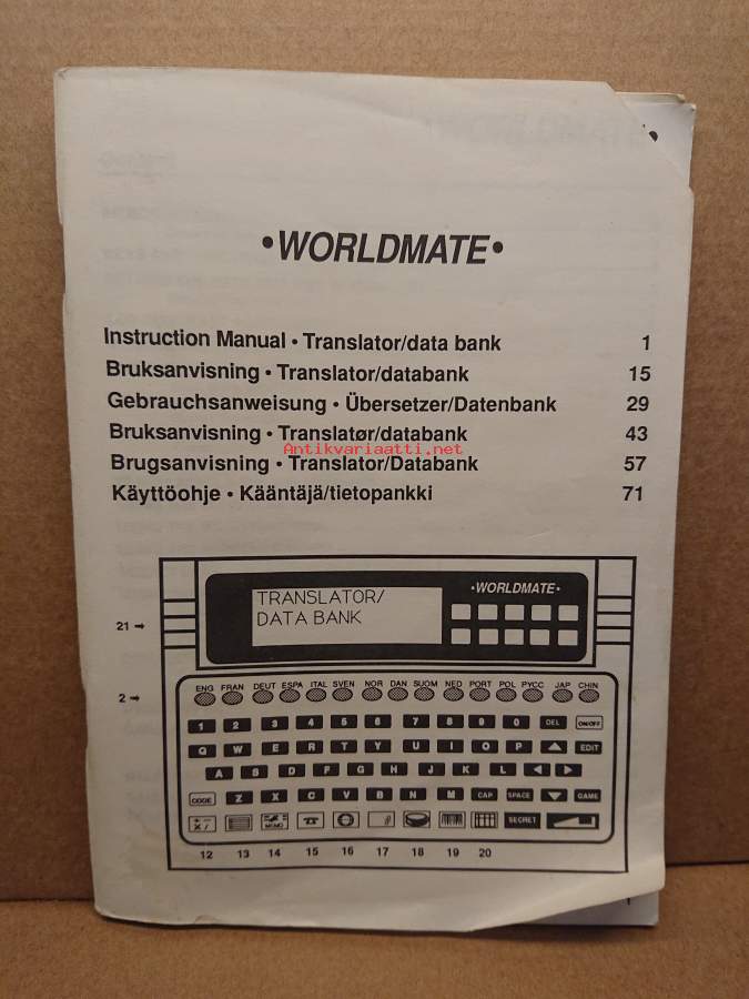 WORLDMATE Instruction Manual Translator/data bank Bruksanvisning. Translator/databank 15 Gebrauchsanweisung Übersetzer/Datenbank 29 Bruksanvisning. Translatør/databank 43 Brugsanvisning. Translator/Databank 57 Käyttöohje. Kääntäjä/tietopankki 71