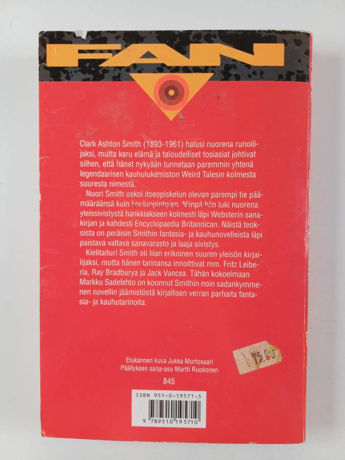 Tyydyttävä. Jonkin verran kulumaa, pienoista repeämää yhdessä kulmassa, melko paljon tahraisuutta, takana vanha hintalappu