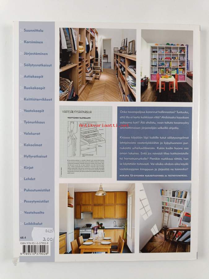 Muu(t) tekijä(t): Pirjo Luoto, Manuel BougotAlkuteos: Organiser ses rangementsAsiasanat: koti, sisustussuunnittelu, asunnot, kalusteet, makuuhuoneet, kylpyhuoneet, tilat, keittiöt, tilasuunnittelu, järjestys, säilytys, vaatehuolto, säilytystilat, työtilat