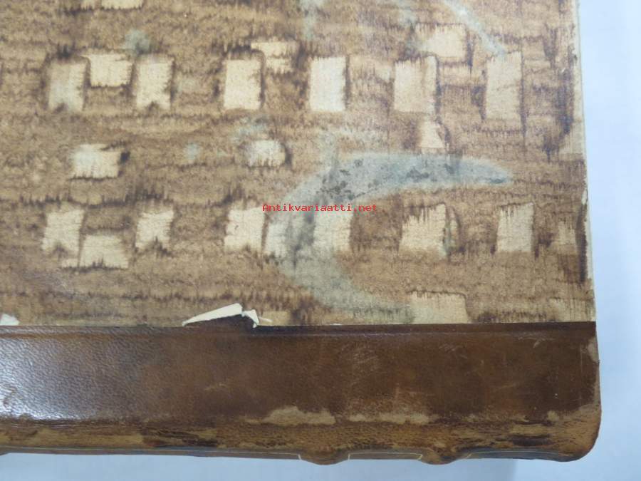 15 x 20 cm, nahkaselkäinen, kansissa käytön jälkiä ja kulumaa.