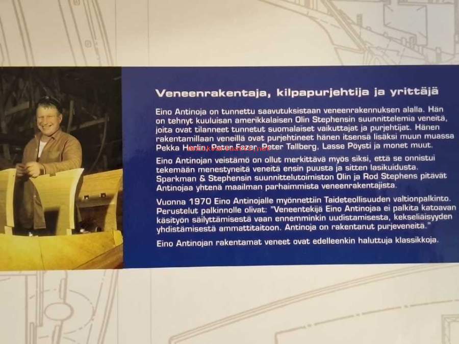 Eino Antinoja on tunnettu saavutuksistaan veneenrakennuksen alalla. Hän on tehnyt kuuluisan amerikkalaisen Olin Stephensin suunnittelemia veneitä, joita ovat tilanneet tunnetut suomalaiset vaikuttajat ja purjehtijat. Hänen rakentamillaan veneillä ovat purjehtineet hänen itsensä lisäksi muun muassa Pekka Herlin, Peter Fazer, Peter Tallberg, Lasse Pöysti ja monet muut. Eino Antinojan veistämö on ollut merkittävä myös siksi, että se onnistui tekemään menestyneitä veneitä ensin puusta ja sitten lasikuidusta. Sparkman & Stephensin suunnittelutoimiston Oli ja Rod Stephens pitävät Antinojaa yhtenä maailman parhaimmista veneenrakentajista. Vuonna 1970 Eino Antinojalle myönnettiin Taideteollisuuden valtionpalkinto. Perustelut palkinnolle olivat: "Veneentekijä Eino Antinojaa ei palkita katoavan käsityön säilyttämisestä vaan ennemminkin uudistamisesta, kekseliäisyyden yhdistämisestä ammattitaitoon. Antinoja on rakentanut purjeveneitä." Eino Antinojan rakentamat veneet ovat edelleenkin haluttuja klassikkoja. Ulkoasu 199 sivua : kuvitettu ; 27 cm Tiivistelmän kieli englantiJulkaisija Helsinki : Rakennusalan kustantajat : Kustantajat Sarmala, 2004Luokitus Liikennevälinetekniikka (udkf 629)Vesiliikenne. Merenkulku (udkf 656.6)ykl 62.54409ykl 69.6309Aiheet Antinoja, Eino, → 1920- veneenrakennus purjeveneet puuveneet veneet rakentaminen purjehdus kilpailut historia henkilöhistoria veneenrakentajat Ilpo KauhanenISBN 951-664-155-5 sidottu