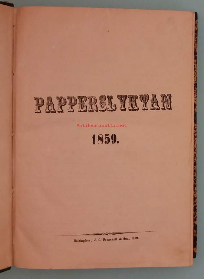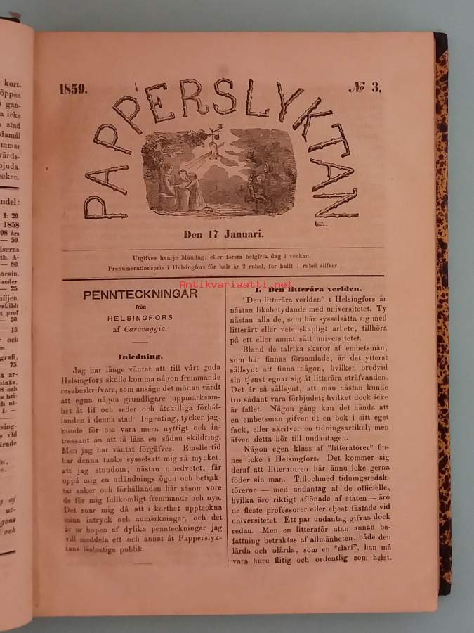 Aikakauslehden vuosikerta 1859 ( erittäin harvinainen ) oli ensimmäinen vuosikerta ? Sisältö mm. Tarinoita, runoja, esseitä, moraalisia pohdintoja, kuvituksia, 52 numeroa. Kerran viikossa ilmestyneen lehden levikki oli 945 kappaletta vuonna 1859. Kuvitettu. Dimensiot 26 ¤ 18 cm. Jälkisidottu.