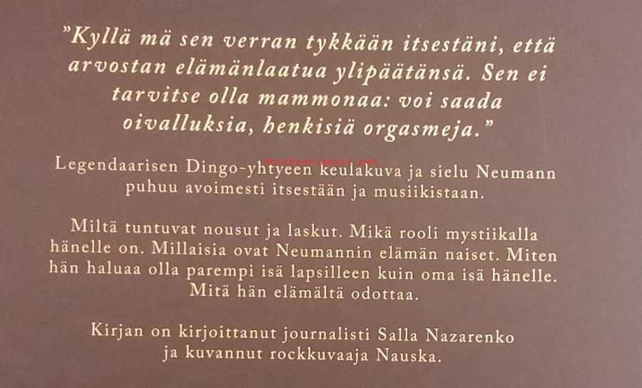 Pertti Neumann on suomalaiseen pop-kulttuuriin suuresti vaikuttaneen Dingon keulakuva ja sielu. Dingon ura käynnistyi raketin lailla vuonna 1984 julkaistun Sinä ja minä -esikoissinglen myötä. Kuvitettu. Dimensiot 30 ¤ 22 cm.