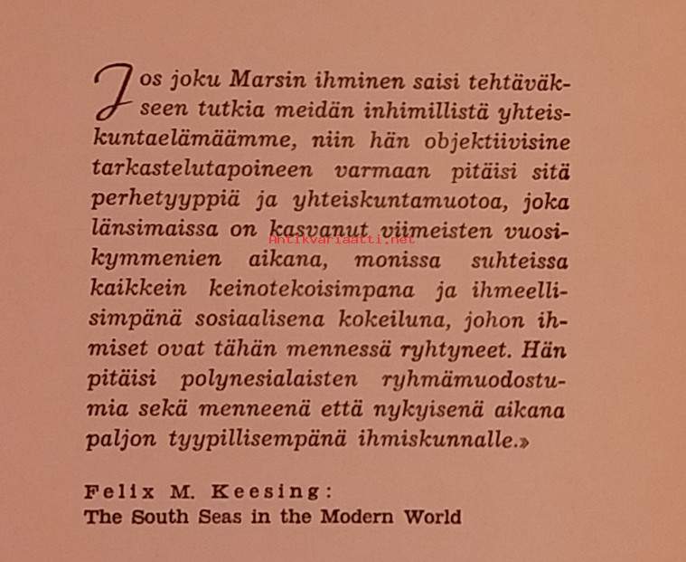 Kulttuuriantropologinen teos tarjoaa näkökulman mm polynesialaisten sukupuolikäyttäytymiseen. Teos ei ole pornografinen vaan etnografinen, ja se pyrkii selittämään polynesialaisten kulttuuria omista lähtökohdistaan. Kuvitettu. Dimensiot 21 ¤ 16 cm.