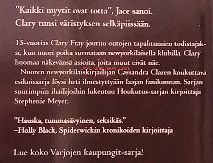15-vuotias Clary Fray todistaa murhan newyorkilaisella Pandemonium-klubilla – mutta kukaan muu ei näytä näkevän tapahtumaa. Pian Clary huomaa näkevänsä asioita, joita muut eivät: demoneita, varjometsästäjiä ja yliluonnollisia olentoja. Dimensiot: 18*11cm.