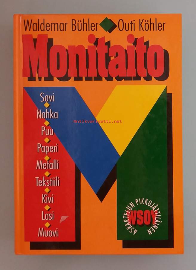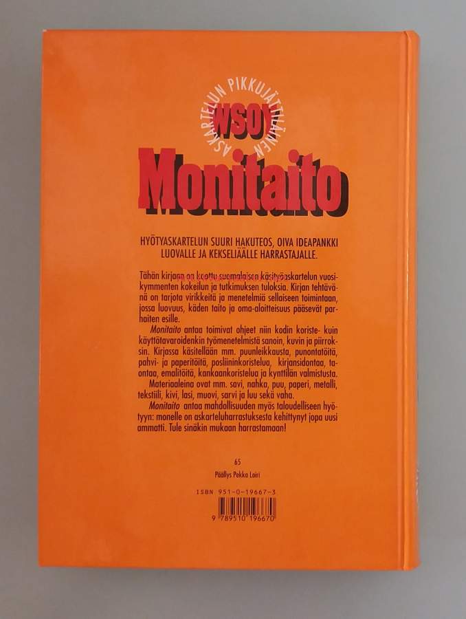 Savi, nahka, puu, paperi, metalli, tekstiili, kivi, lasi ja muovi. Askartelun pikkujättiläinen. Teokseen on koottu suomalaisen käsityöaskartelun vuosikymmenten kokeilun ja tutkimuksen tuloksia. Toimivat ohjeet niin kodin koriste- kuin käyttötavaroiden työmenetelmistä, joissa käden taito ja luovuus pääsevät esille. Kirjan dimensiot: 24 cm * 18 cm. Kuvitettu.