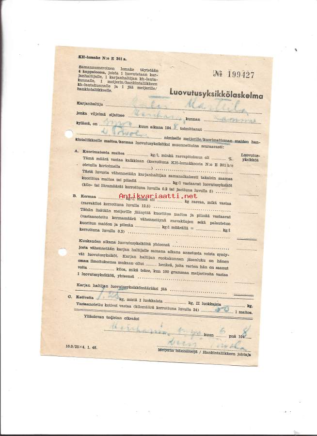 Luovutusyksikkölaskelma / Häntälän Osuusmeijeri 1947 ja Ostokuitti / Satakunnan Osuusteurastamo 1941 - kansanhuoltolomake 2 kpl