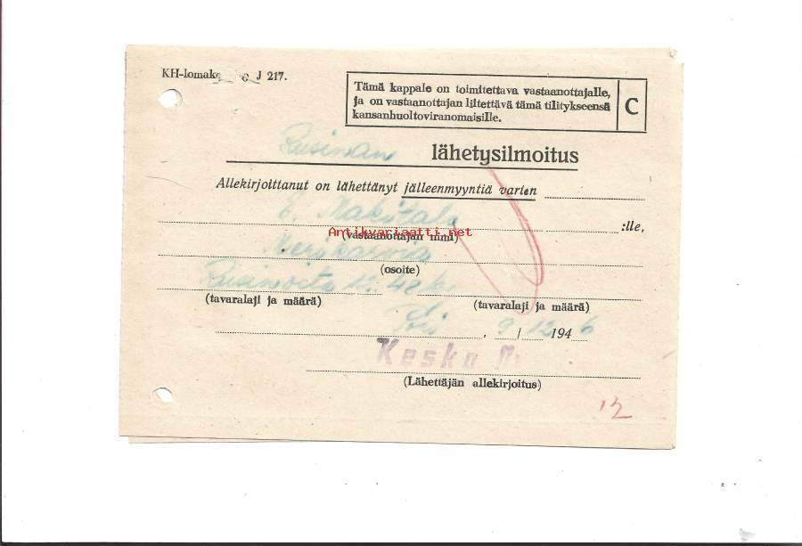 Rusinan lähetysilmoitus / Kesko Oy 1946
