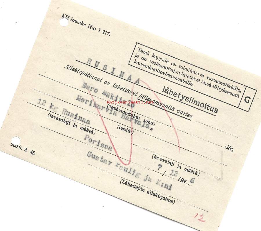Rusinaa lähetysilmoitus / Gustav Paulig ja K:ni 1946