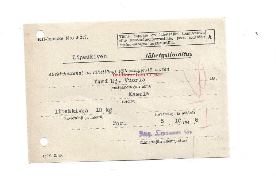 Lipeäkiven lähetysilmoitus / Aug Lipsanen Oy Pori