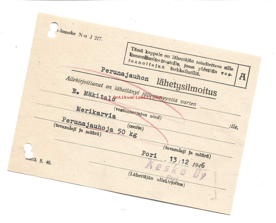 Perunajauhojen lähetysilmoitus / Kesko Oy Pori 1946