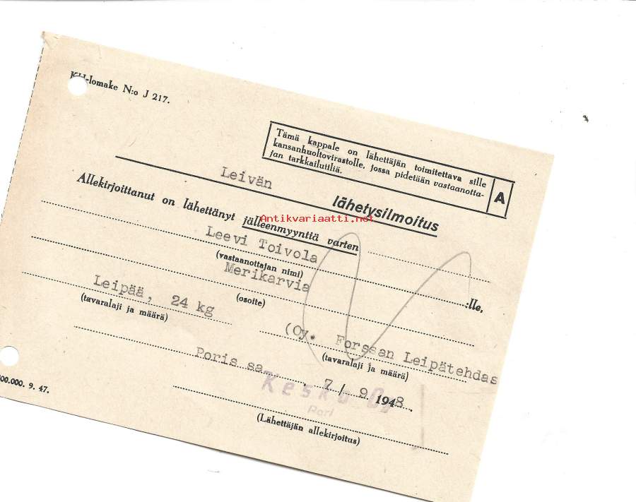 Leivän lähetysilmoitus / Kesko Oy Pori / Forssan Leipätehdas Oy 1948