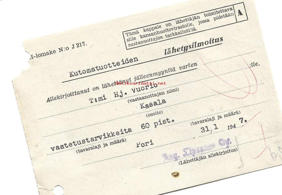 Kutomatuotteiden lähetysilmoitus / Aug Lipsanen 1947