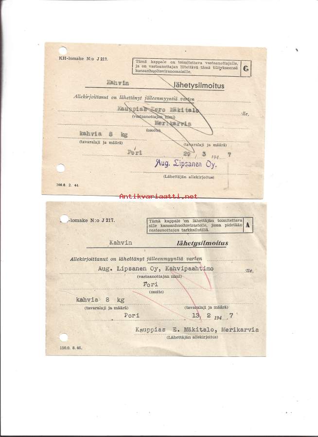 Kahvin lähetysilmoitus / Aug Lipsanen / Kauppias Eero Mäkitalo 1947