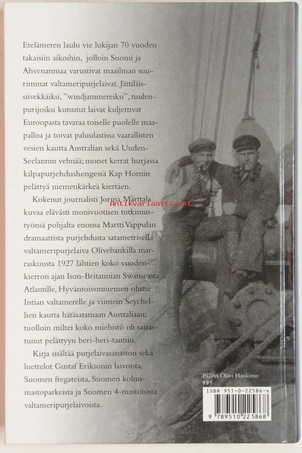 Teoksessa seurataan Martti Vappulan dramaattista purjehdusta satametrisellä valtameripurjelaivalla 1927 lähtien koko vuoden kierron ajan Iso-Brittaniasta aina Australiaan asti.Kuvitettu.Dimensiot: 21x13cm
