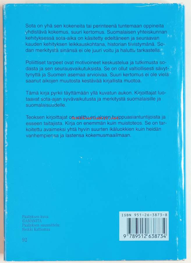 Kirjassa pohditaan sota-ajan syvävaikutusta ja merkitystä suomalaisille ja suomalaisuudelle.Dimensiot: 22x15cm