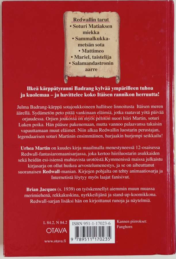 Kirja on kuudes kirja maailmalla menestyneessä 12-osaisessa Redwall fantasiaromaanisarjassa.Dimensiot: 22x15cm