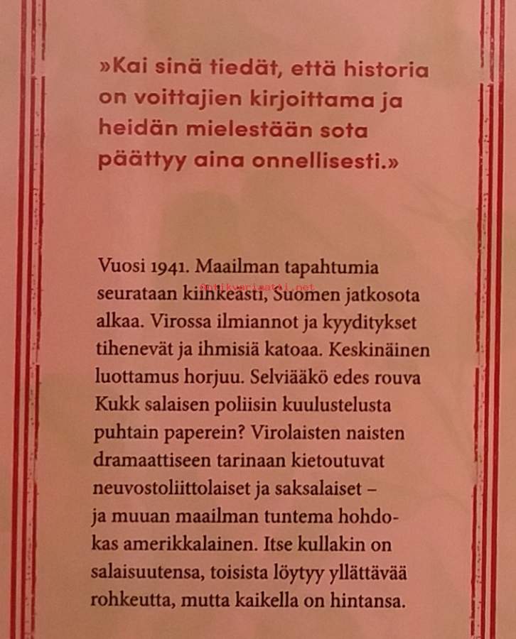 Romaani kuvaa virolaisten naisten kohtaloa Tallinnan bordellissa vuonna 1941 neuvostomiehityksen aikana.