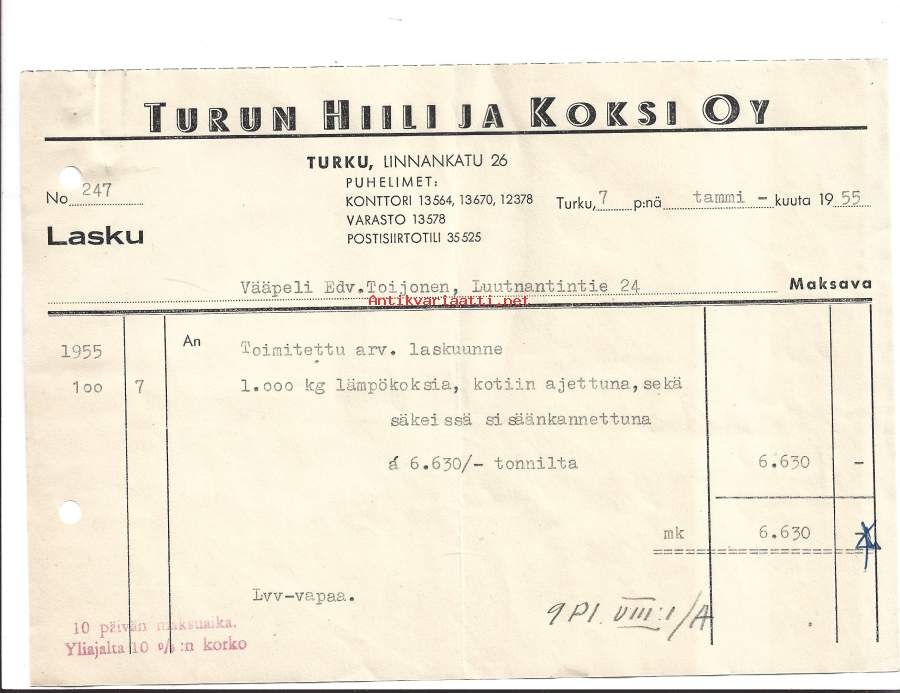 Turun Hiili ja Koksi Oy Turku 1955 - firmalomake
