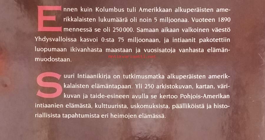 Kirja on tutkimusmatka alkuperäisten amerikkalaisten elämäntapaan. Yli 250 arkistokuvan, kartan värikuvan ja taide-esineen avulla se kertoo Pohjois-Amerikan intiaanien elämästä, kulttuurista, uskomuksista, päälliköistä ja historiallisista tapahtumista eri heimojen elämässä. Dimensiot 33 ¤ 26 cm.