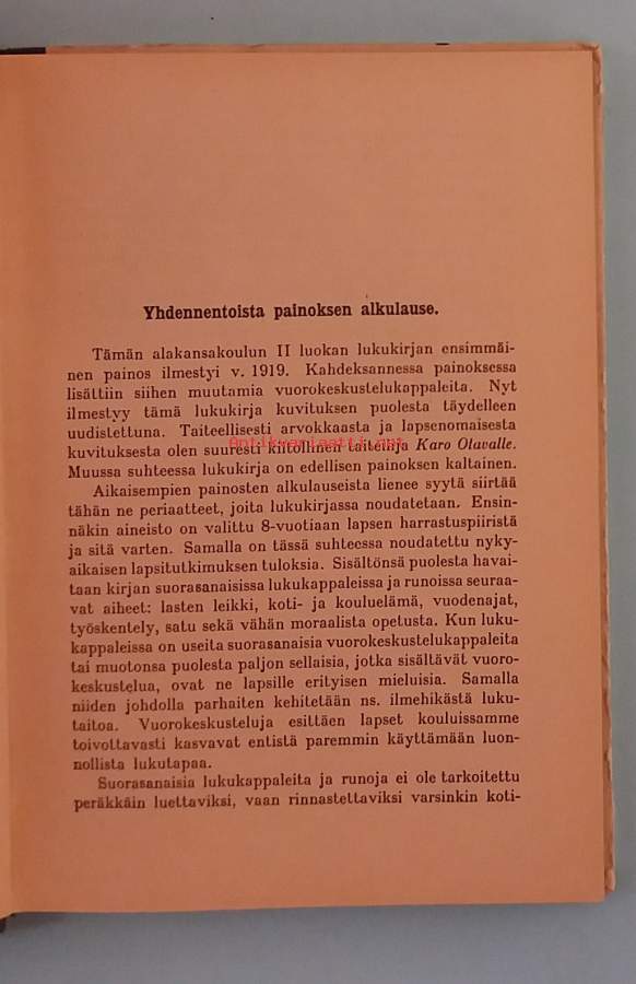 Lukukirja edustaa suomalaista koulukirjaperinnettä ja on osa vanhojen lukukirjojen kulttuurihistoriaa. Kuvitettu. Dimensiot 21 ¤ 15 cm.
