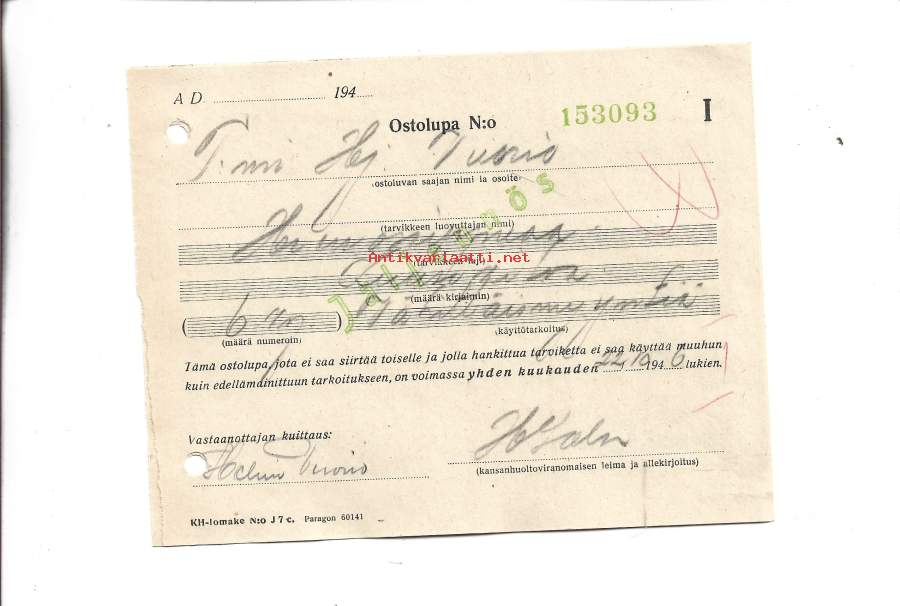 Ostolupa 1946 - suolaa Merikarvian Kansanhuoltolautakunta / Kansa myymälä 17 2 kpl erä