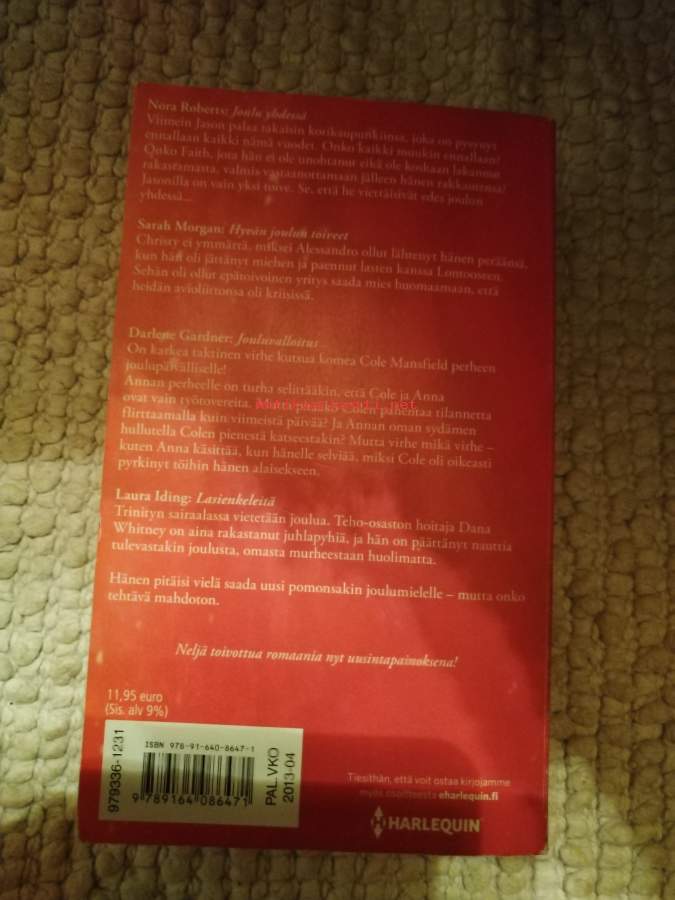 Nora Roberts : joulu yhdessäSarah Morgan : hyvän joulun toiveetDarlene gardner: jouluvalloitusLaura iding : lasienkeleitä