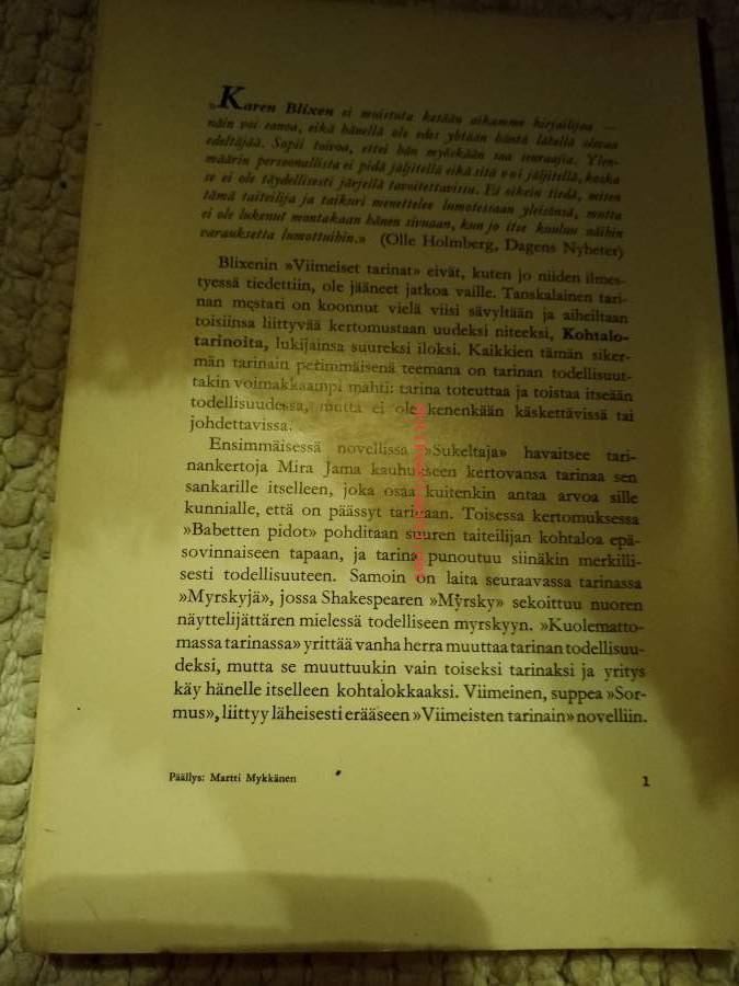 KohtalotarinoitaAnecdotes of destinyKirjaHenkilö Blixen, Karen ; Kilpi, MikkoWSOY 1958.