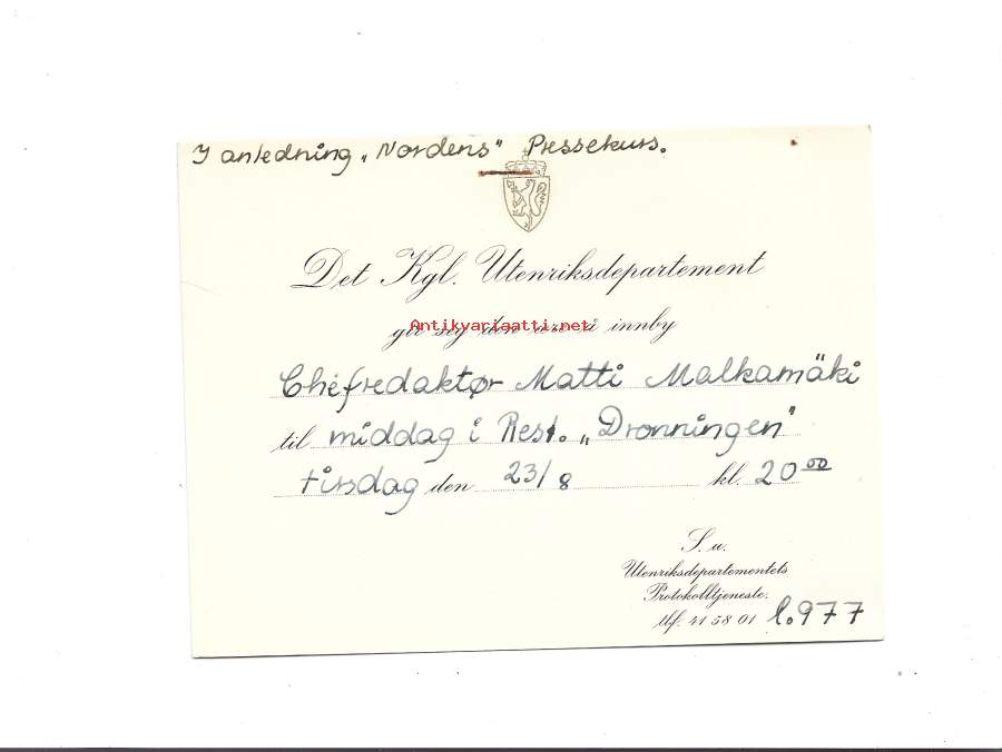 Det Kgl Utenriketsdepartement innby til midddag i Rest Dronningen - kutsu päivälliselle
