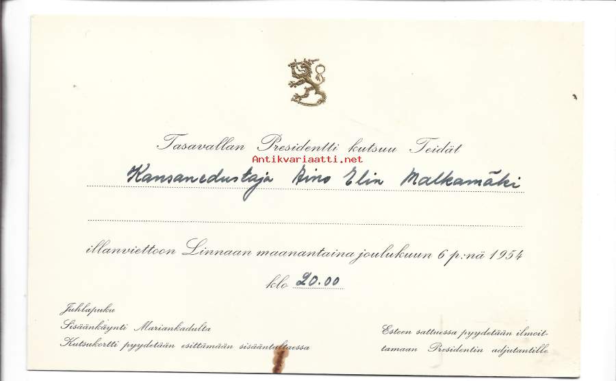 Tasavallan Presidentti Juho Kusti Paasikivi kutsuu Teidät Linnaan joulukuun 6 p:nä 1954 kutsu linnan Itsenäisyyspäivän juhliin