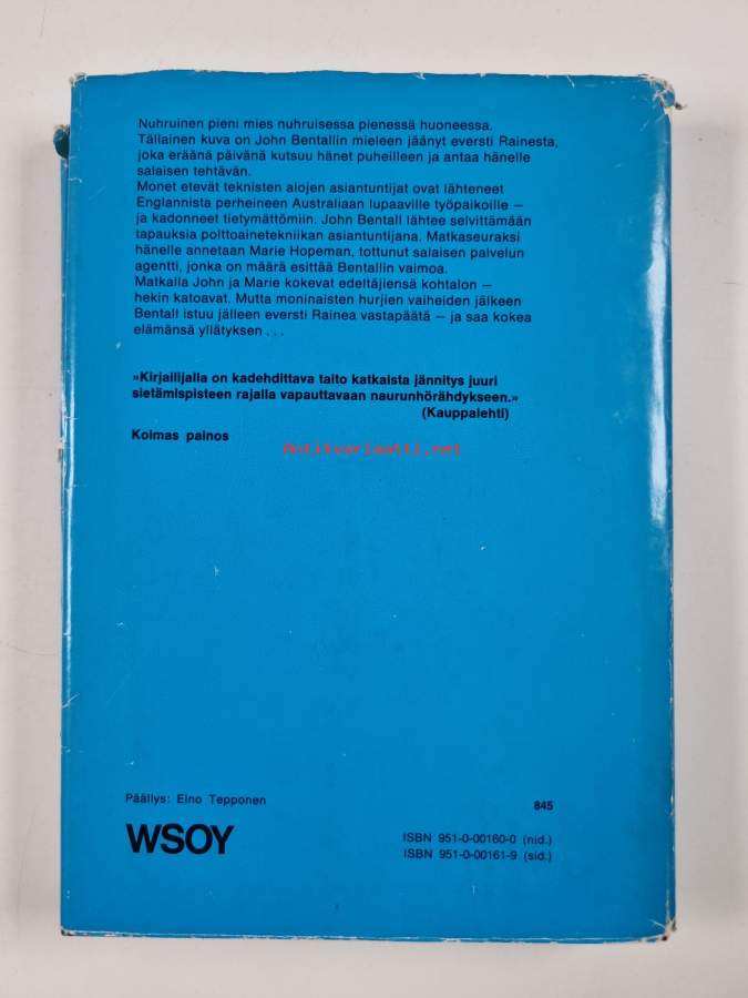 Hyvä. Pienoista kulumaa kansissa, selkämyksessä vinoutta. Kansipaperin kunto: joitain repeämiä/kulumaa